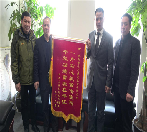 1月22日,平江縣梅仙鎮玳璋村幫扶對象,將一面寫著"一片初心扶貧傳佳話,千秋功績留愛在平江"18個大字的鮮紅錦旗送到市水建投董事長劉寶山、總經理楊雄輝的手中,對市水建投對精準扶貧工作的大力支持表達誠摯謝意。