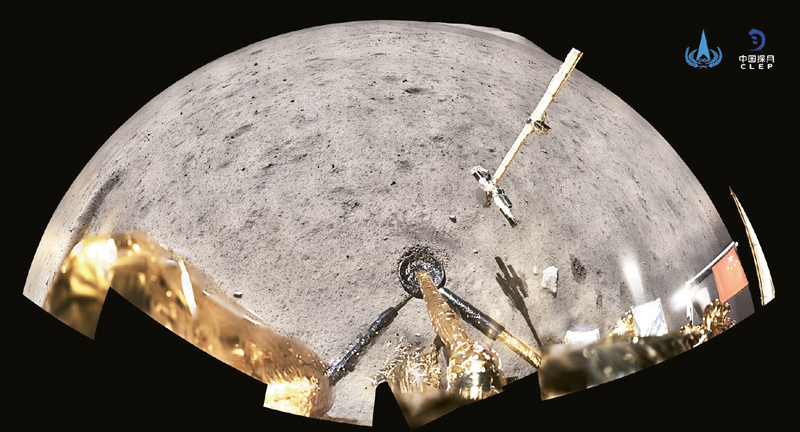 2020年12月4日,國(guó)家航天局公布了探月工程嫦娥五號(hào)探測(cè)器在月球表面國(guó)旗展示的照片。嫦娥五號(hào)著陸器和上升器組合體全景相機(jī)環(huán)拍成像,五星紅旗在月面成功展開,此外圖像上方可見已完成表取采樣的機(jī)械臂及采樣器。 新華社發(fā)(國(guó)家航天局供圖)