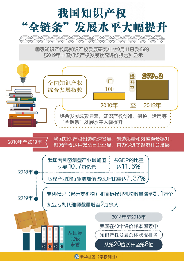 ——在完善法律法規(guī)方面,基本建立起符合國(guó)際通行規(guī)則、門類較為齊全的知識(shí)產(chǎn)權(quán)法律制度,實(shí)現(xiàn)了專利、商標(biāo)、地理標(biāo)志等知識(shí)產(chǎn)權(quán)的全方位、立體化保護(hù)。加入世貿(mào)組織以來,中國(guó)先后多次修訂專利法、商標(biāo)法和著作權(quán)法等法律,基本形成了知識(shí)產(chǎn)權(quán)“嚴(yán)保護(hù)”的法律制度體系。